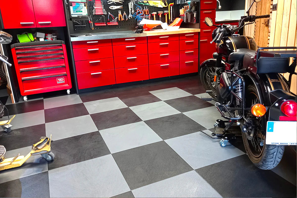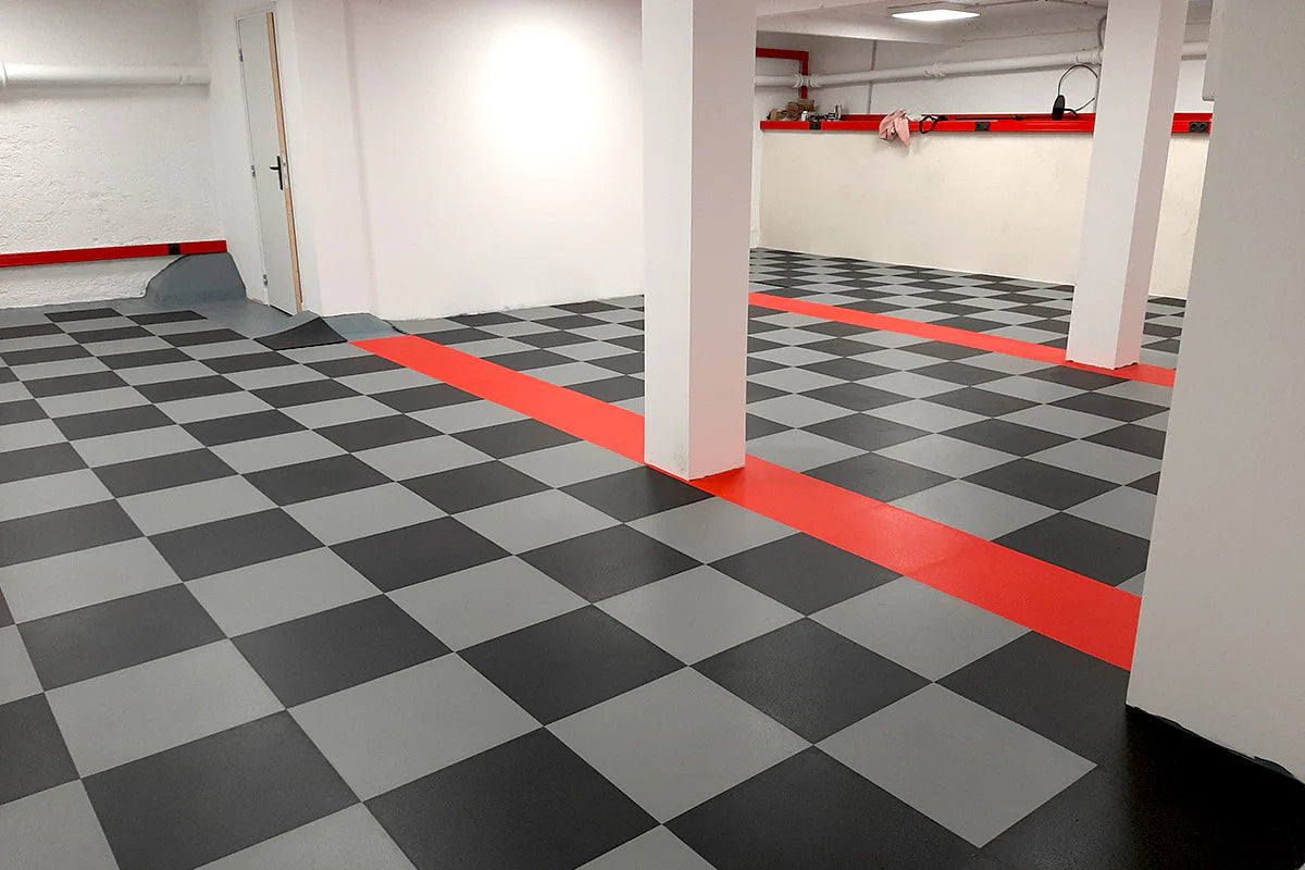 VIELSEITIGER PVC-BODENBELAG, DER FÜR ALLE MÖGLICHEN ZWECKE VERWENDET WIRD: GARAGE, WERKSTATT, BÜRO, HANDEL USW.